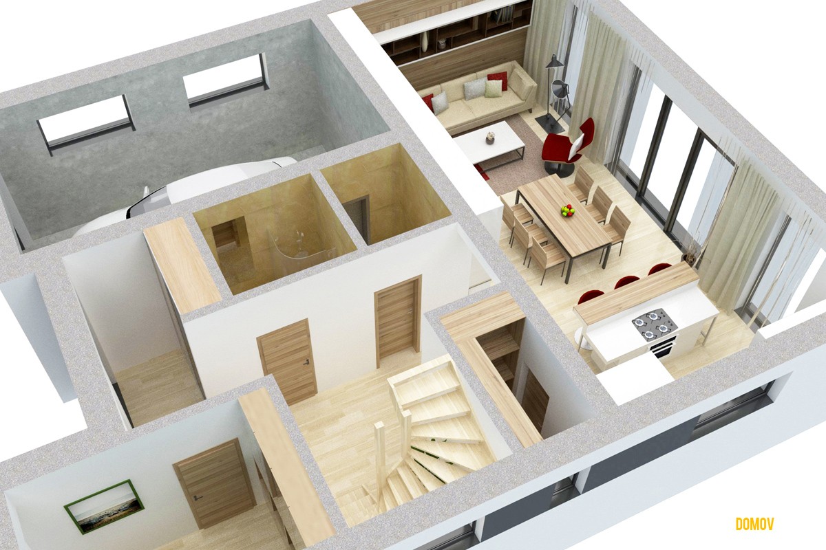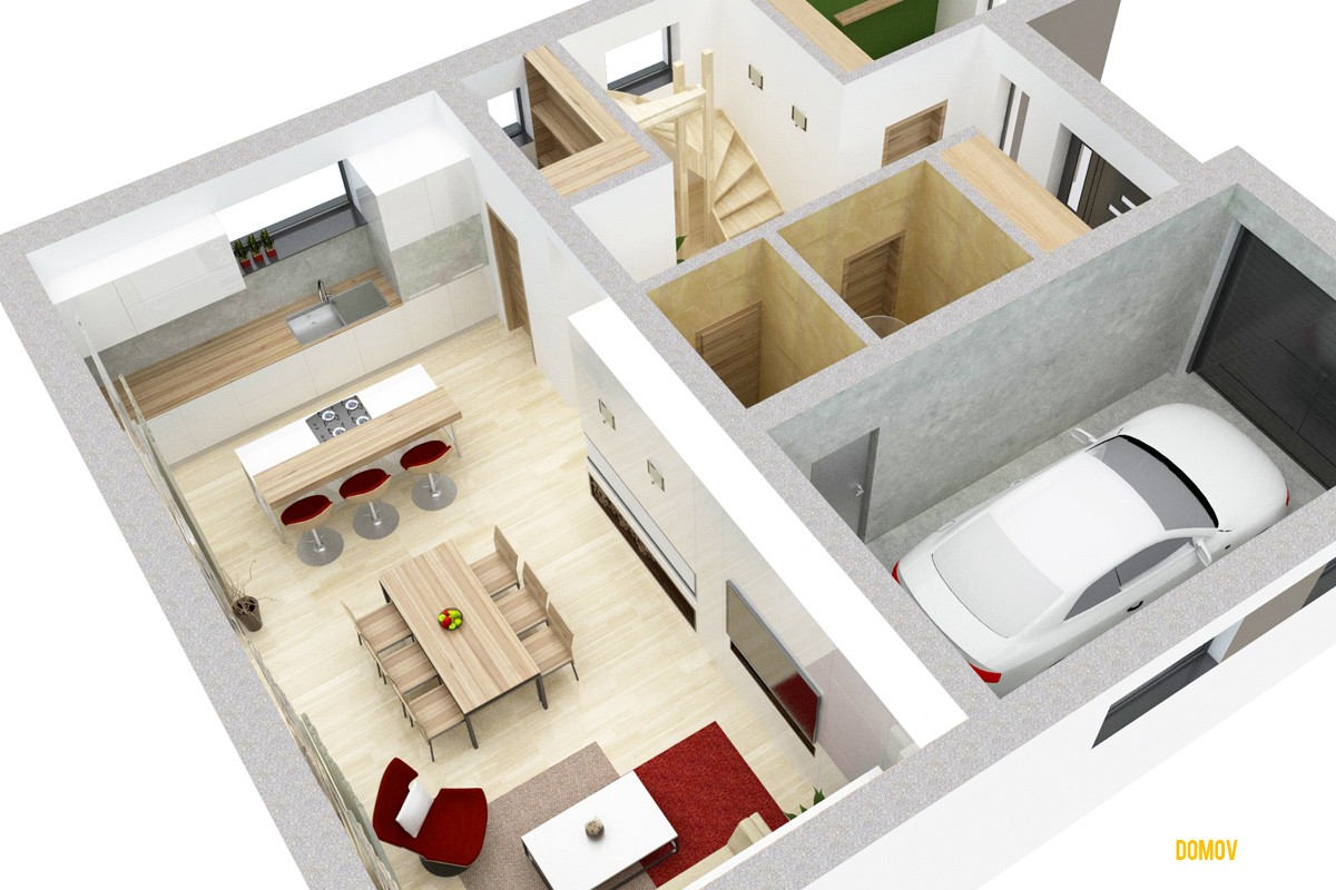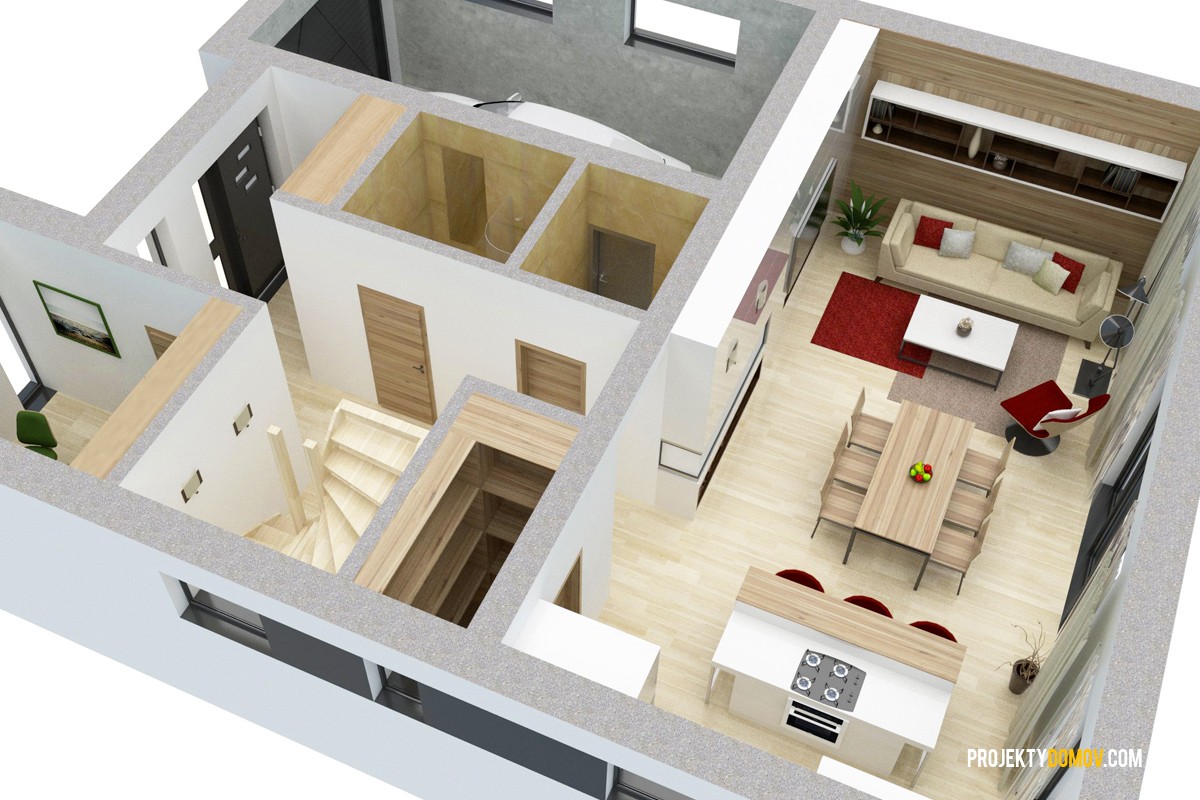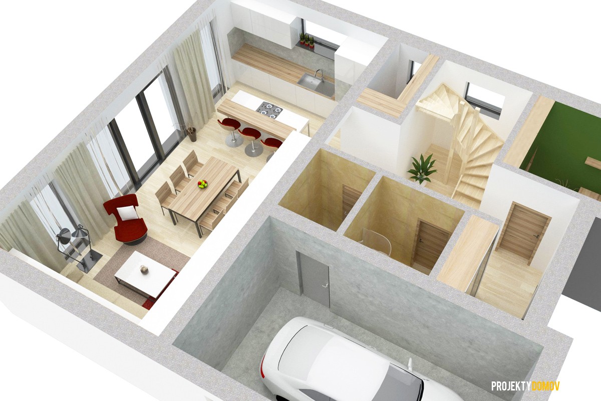 projekt domu LOTUS predstavuje výnimočnú kombináciu moderného dizajnu a praktickej dizpozícií. Je stvorený pre ľudí, ktorí sa chcú odlišovať od bežného priemeru. Každý priestor na dome je prakticky využitý s minimálnym množstvom hluchých plôch. V prípade potreby sa dá garáž premeniť na ďalšiu malú bytovú jednotku so samostatným vchodom a kúpeľňou, alebo šiestu izbu. Na základe záujmu zákazníkov sme zväčšili priestor schodiska, čím sa schody stali pohodlnejšie na výstup. Preto niektoré interiérové vizualizácie môžu byť mierne odlišné od aktuálnej (vylepšenej) verzie projektu.