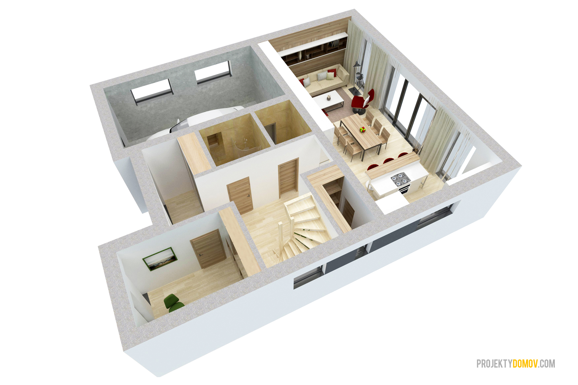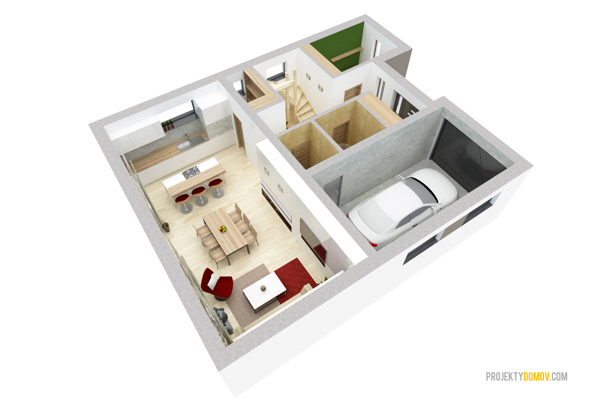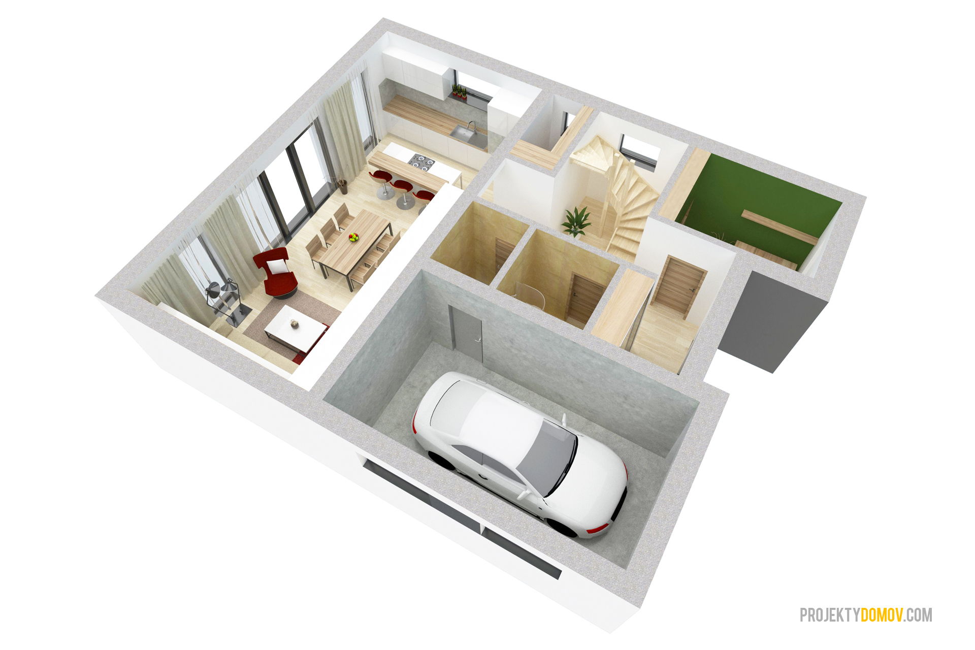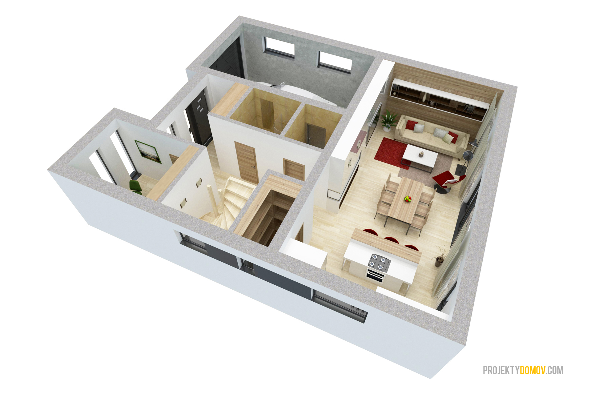 projekt domu LOTUS predstavuje výnimočnú kombináciu moderného dizajnu a praktickej dizpozícií. Je stvorený pre ľudí, ktorí sa chcú odlišovať od bežného priemeru. Každý priestor na dome je prakticky využitý s minimálnym množstvom hluchých plôch. V prípade potreby sa dá garáž premeniť na ďalšiu malú bytovú jednotku so samostatným vchodom a kúpeľňou, alebo šiestu izbu. Na základe záujmu zákazníkov sme zväčšili priestor schodiska, čím sa schody stali pohodlnejšie na výstup. Preto niektoré interiérové vizualizácie môžu byť mierne odlišné od aktuálnej (vylepšenej) verzie projektu.