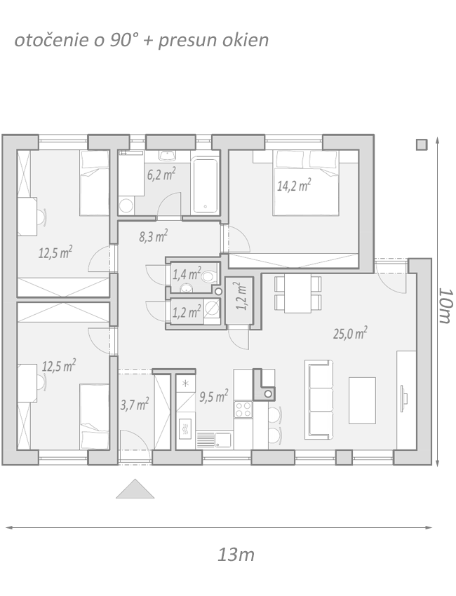 projekt domu FLIP predstavuje racionálnu a ekonomickú koncepciu bývania. Jednoduchá konštrukcia objektu umožnuje rýchlu a bezproblémovú výstavbu tak svojpomocne, ako aj cez stavebnú firmu. Jednoduchým prehodením okien na priľahlé steny (viď ukážka) sa dom premení na úplne novú koncepciu, čím sa svojim natočením stáva vhodný na akýkoľvek typ pozemku.