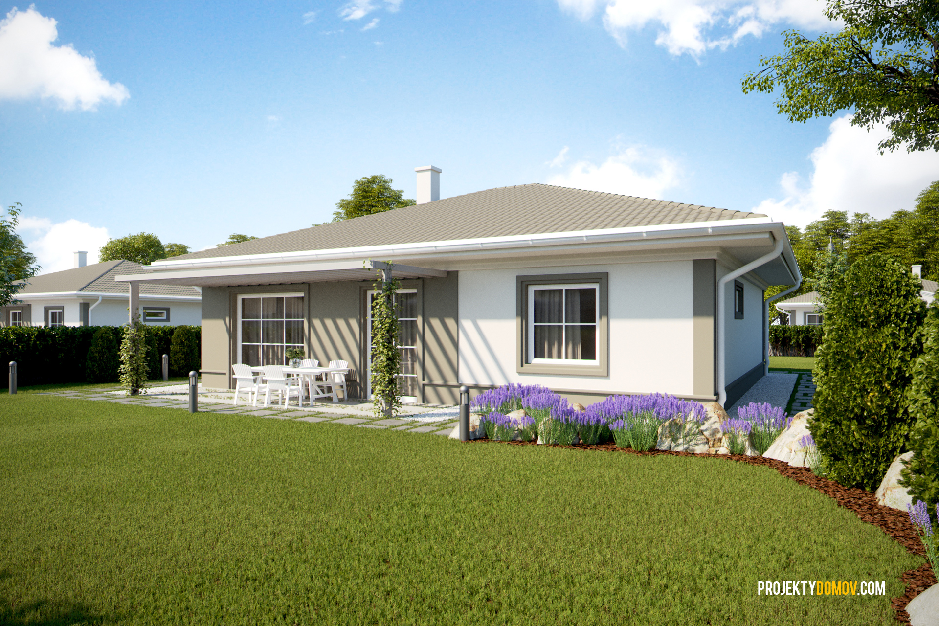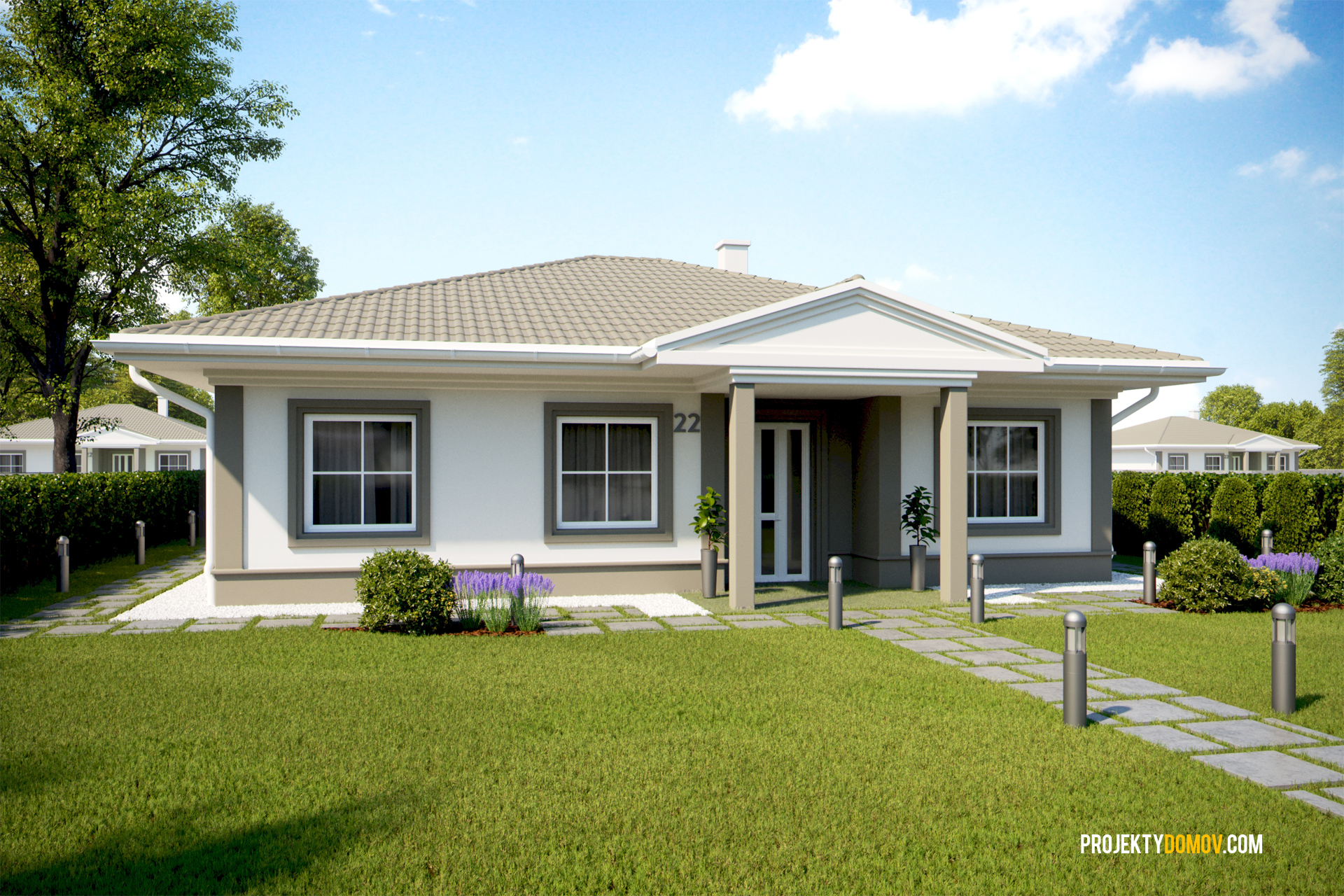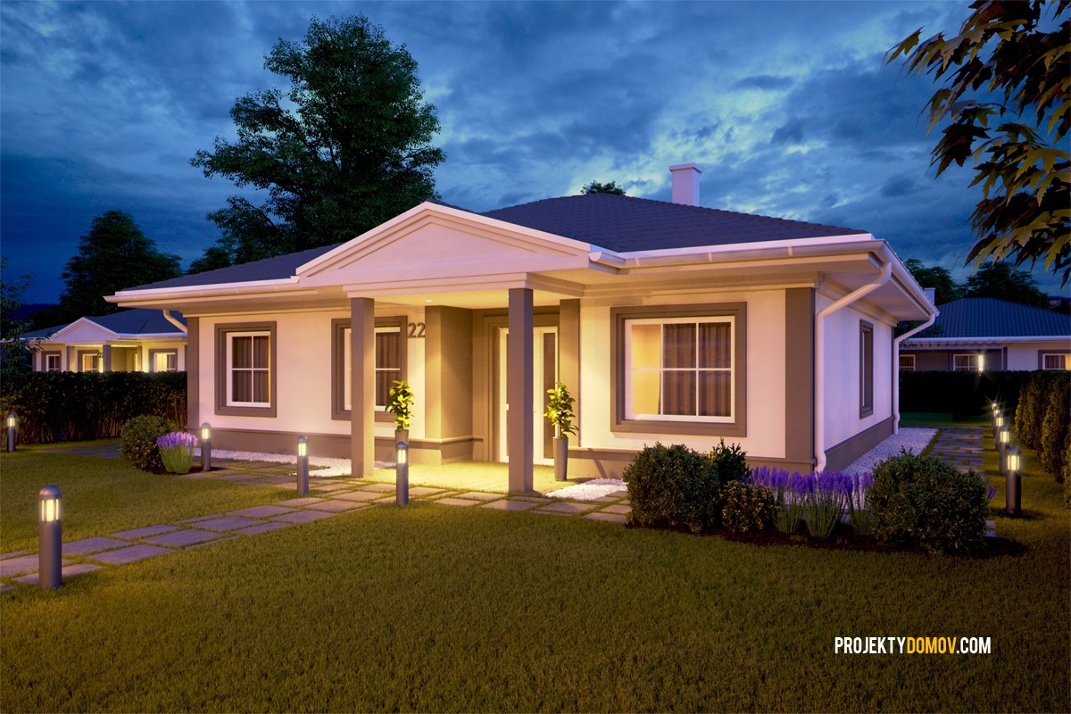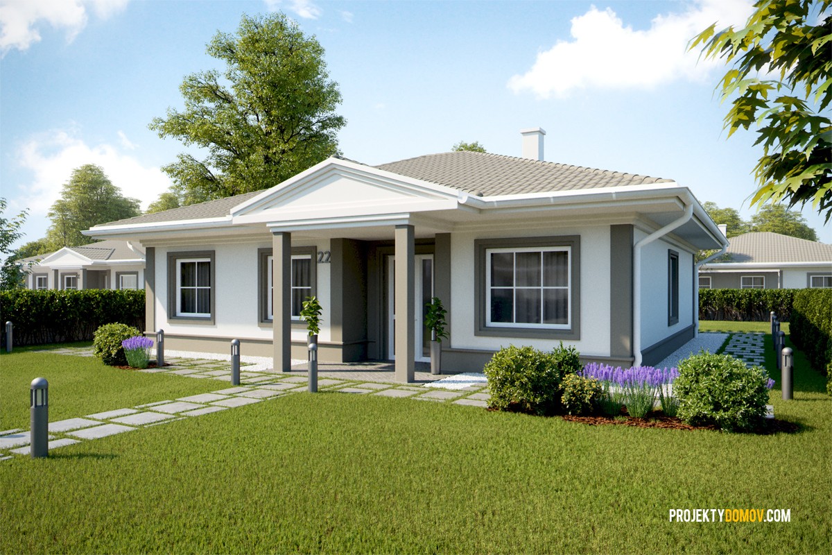 projekt rodinného domu v modernom vintage štýle, založený na racionálnej pôdorysnej koncepcii. Na menšej zastavanej ploche a pri nízkych výstavbových nákladoch získate plnohodnotný 5-izbový rodinný dom, alebo 4-izbový s rozšírenou obývačkou, prípadne garážou. Vybrať si taktiež môžete či chcete projekt s prednou strieškou vo vintage štýle, alebo v modernej verzii bez predného prestrešenia (viď ukážka).