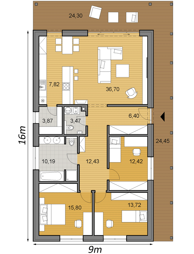 pre ľudí, ktorí maju radi väčší priestor sme pripravili overenú a obľúbenú dispozičnú koncepciu, “nafúknutú” o pár metrov štvorcových. Vznikol tak projekt domu TIP, pri ktorom sme sa navyše “vyhrali” s terasovým prestrešením, ktoré je nielen praktické, ale aj oku lahodiace. V prípade limitovaného výstavbového rozpočtu, odporúčame zvážiť taktiež koncepčne podobný, avšak rozmerovo menší projekt domu LEMON.
